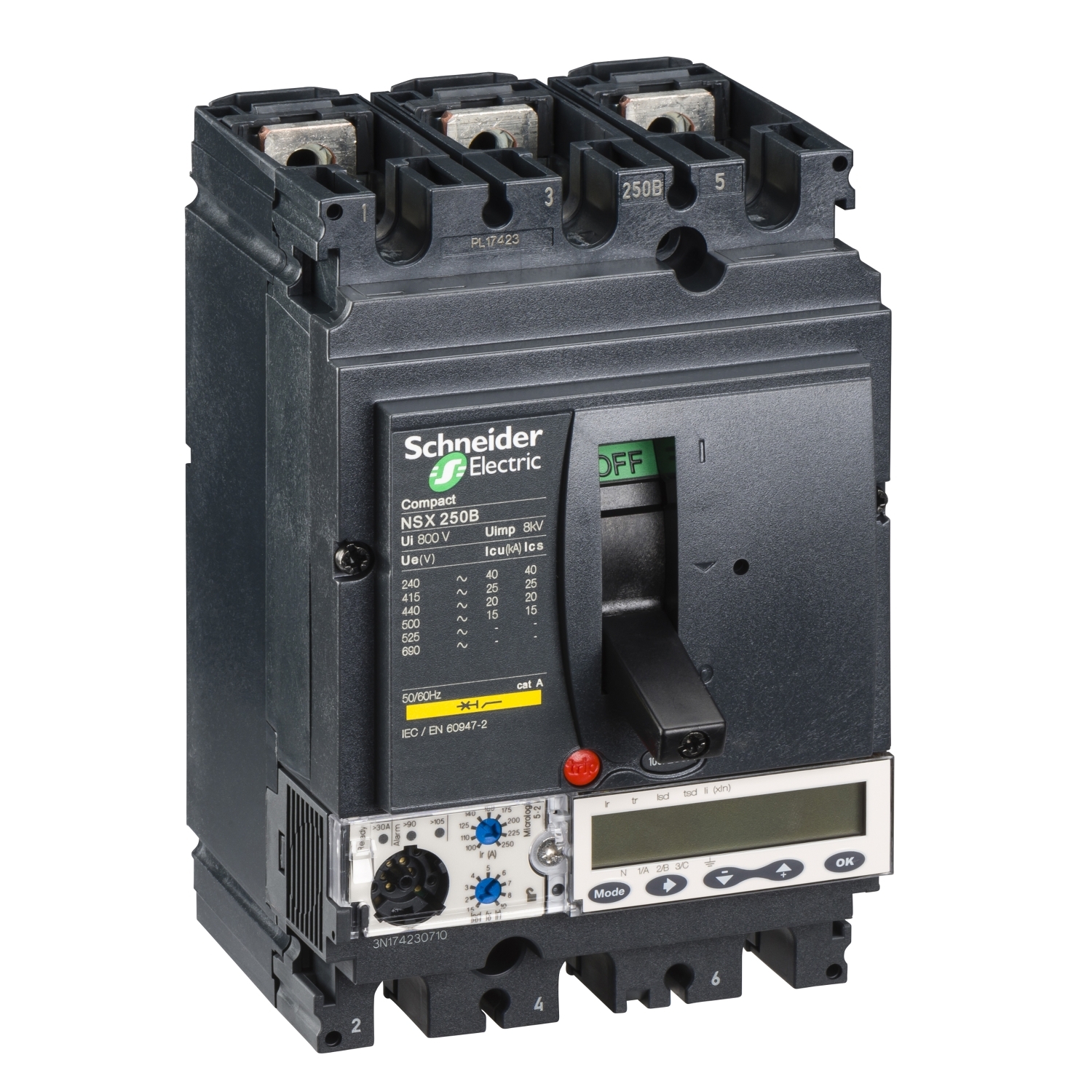 • Schneider Electric MCCB rated at 250 Amperes, ideal for industrial and high-power commercial AC networks.