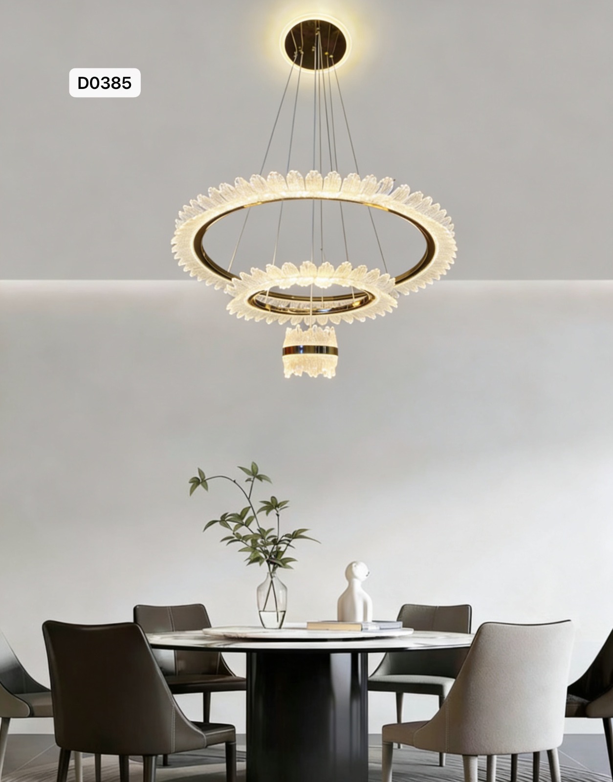 تصميم دائري مزدوج مزخرف بعناصر كريستالية على شكل أوراق، مع وحدة إضاءة أسطوانية متدلية مزخرفة أيضًا بالكريستال، يضيف لمسة فاخرة وأنيقة لغرف الطعام والمعيشة.